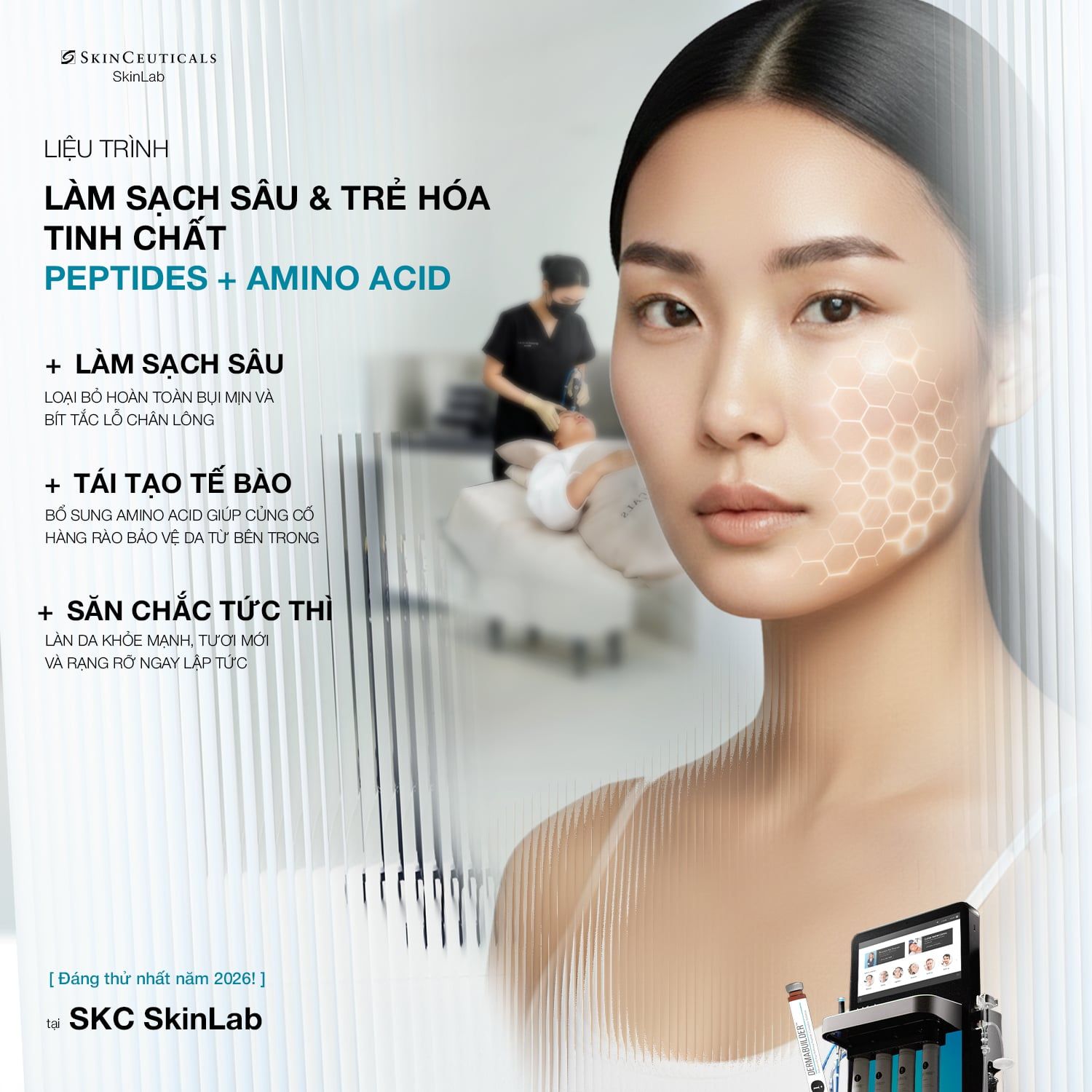 Dẫn truyền tổ hợp Peptides & Amino Acid thiết yếu vào tầng sâu, kích hoạt tăng sinh Collagen giúp da săn chắc, đàn hồi và xóa mờ các nếp nhăn mảnh.